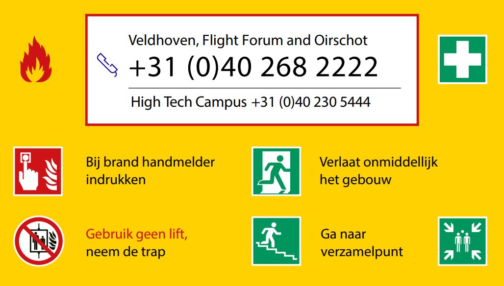 Wij zijn niet bevoegd om personen aan te spreken op hun gedrag op het ASML terrein, bij brand of een ander noodgeval bel een van de onderstaande nummers: