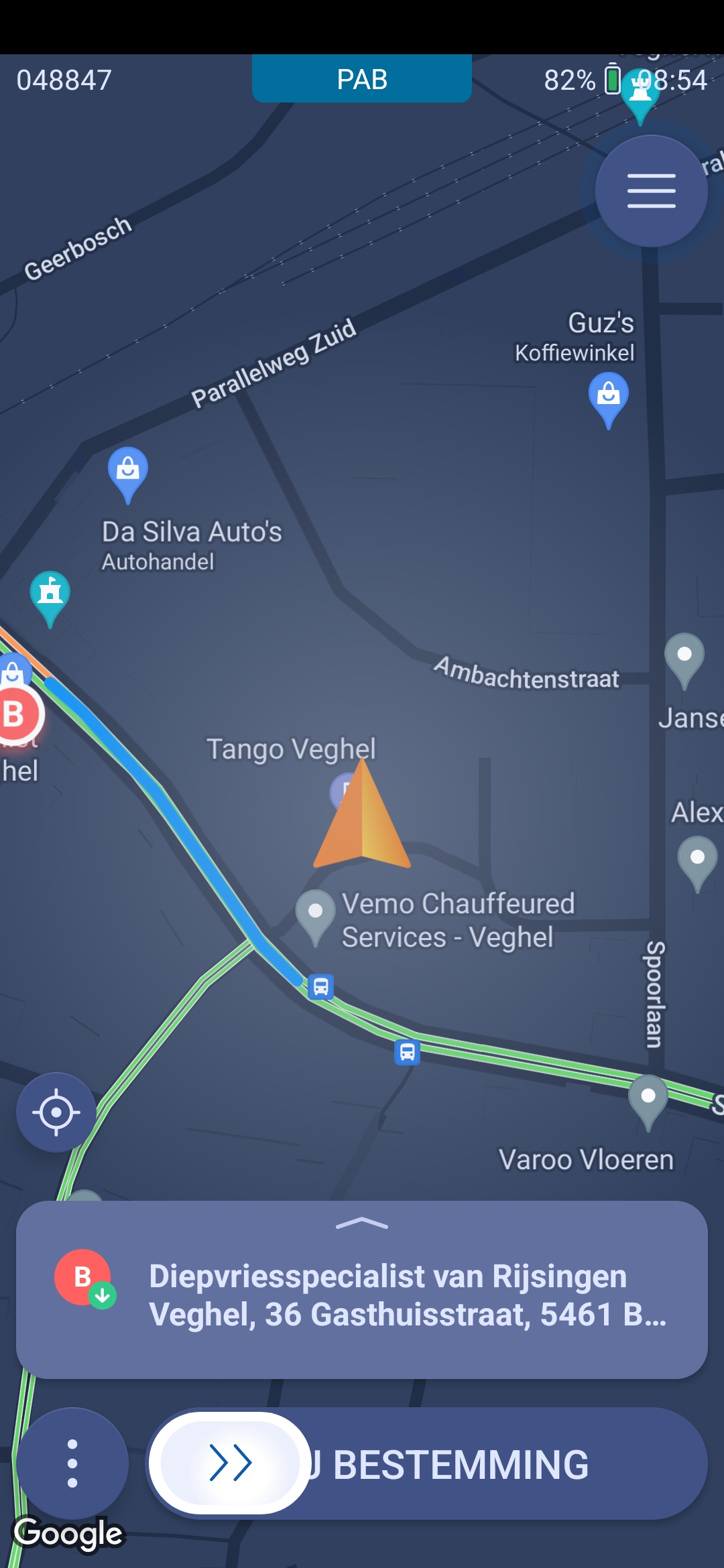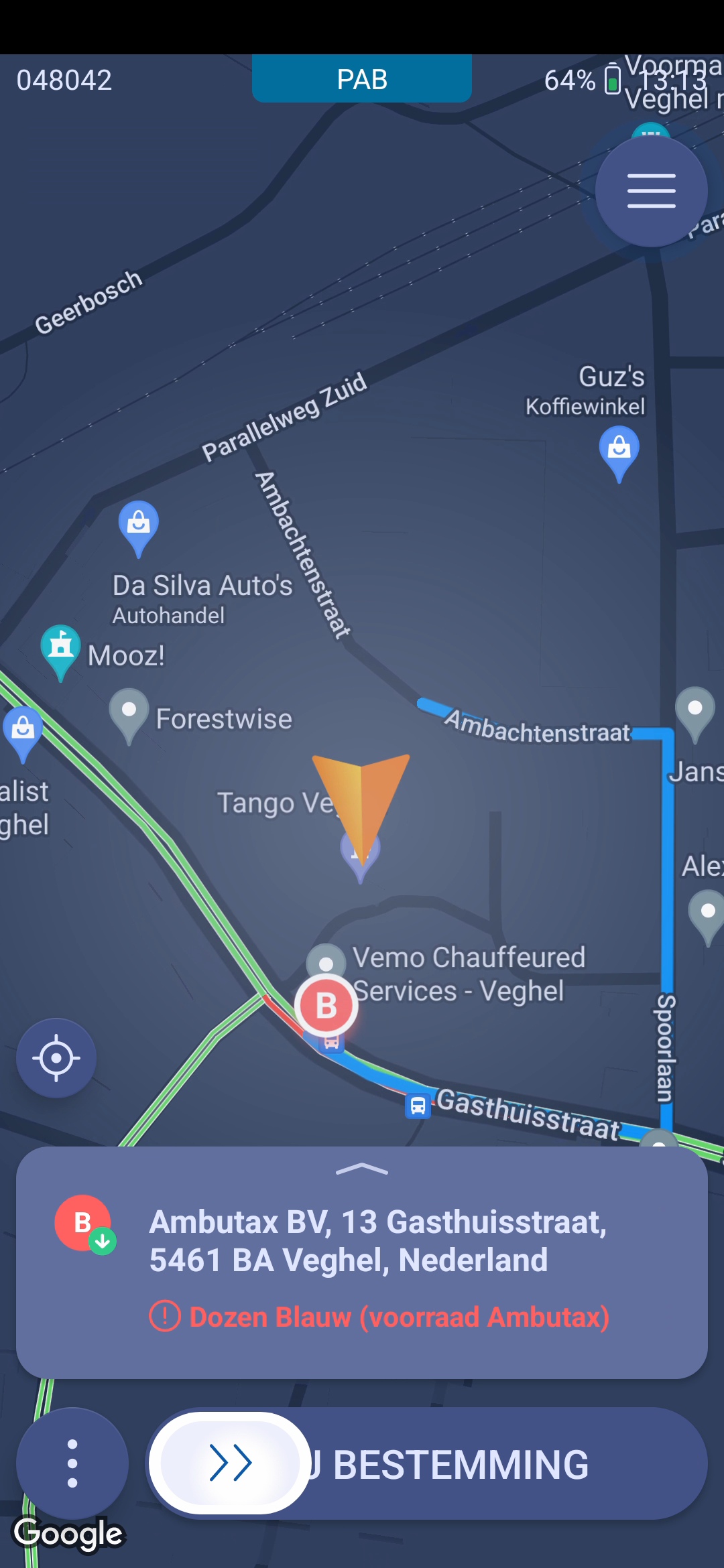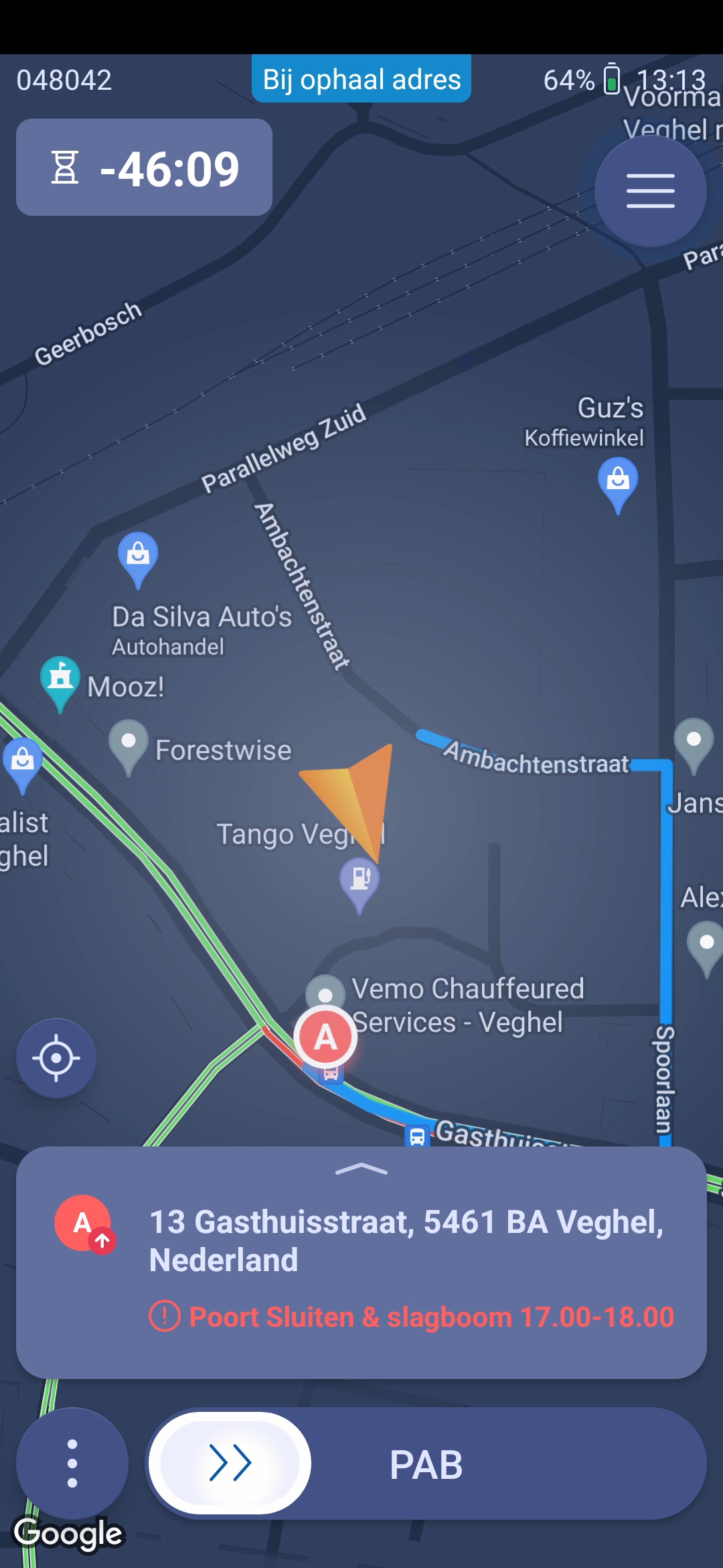 - Wanneer de klant in de auto zit, verander je je status naar "PAB" (passagier aan boord) door naar rechts te swipen, je ziet het volgende scherm: