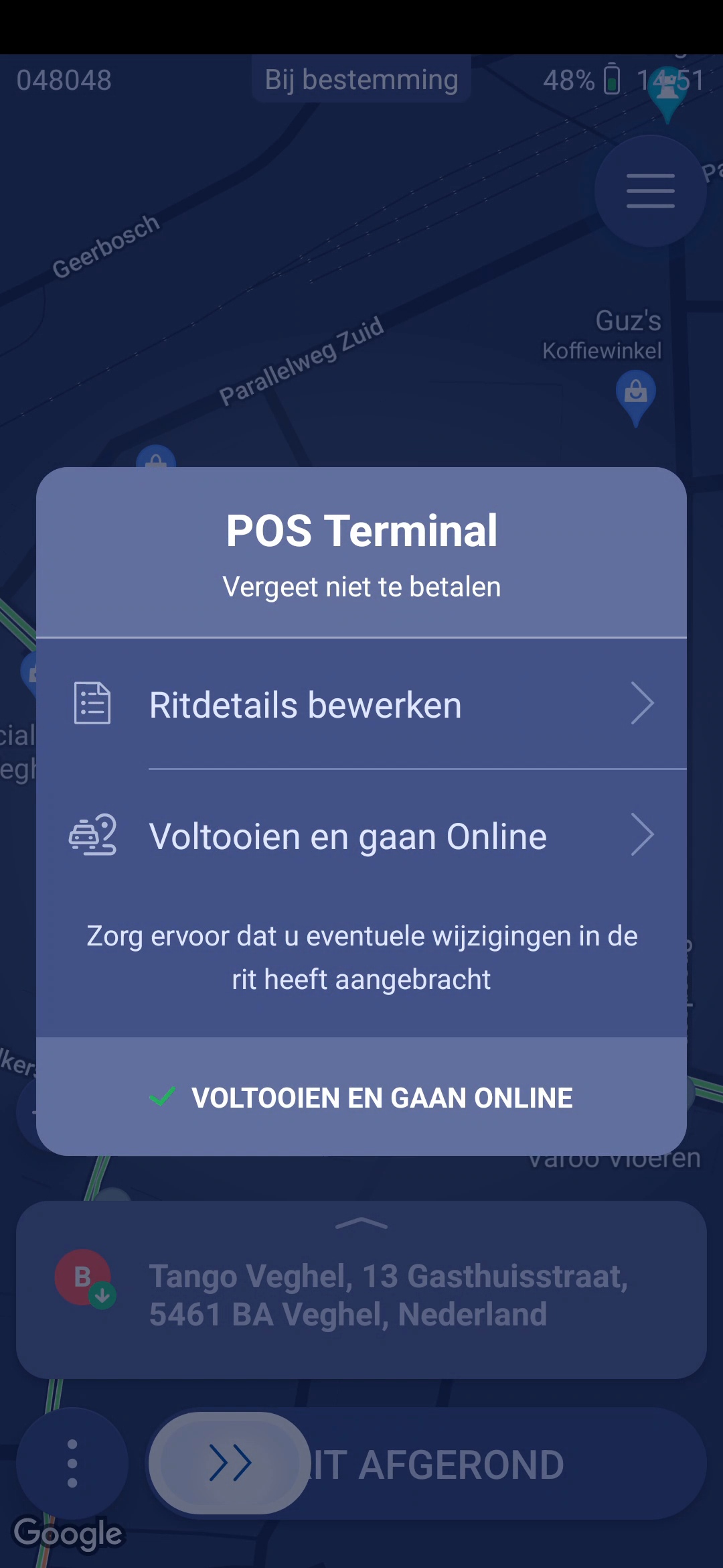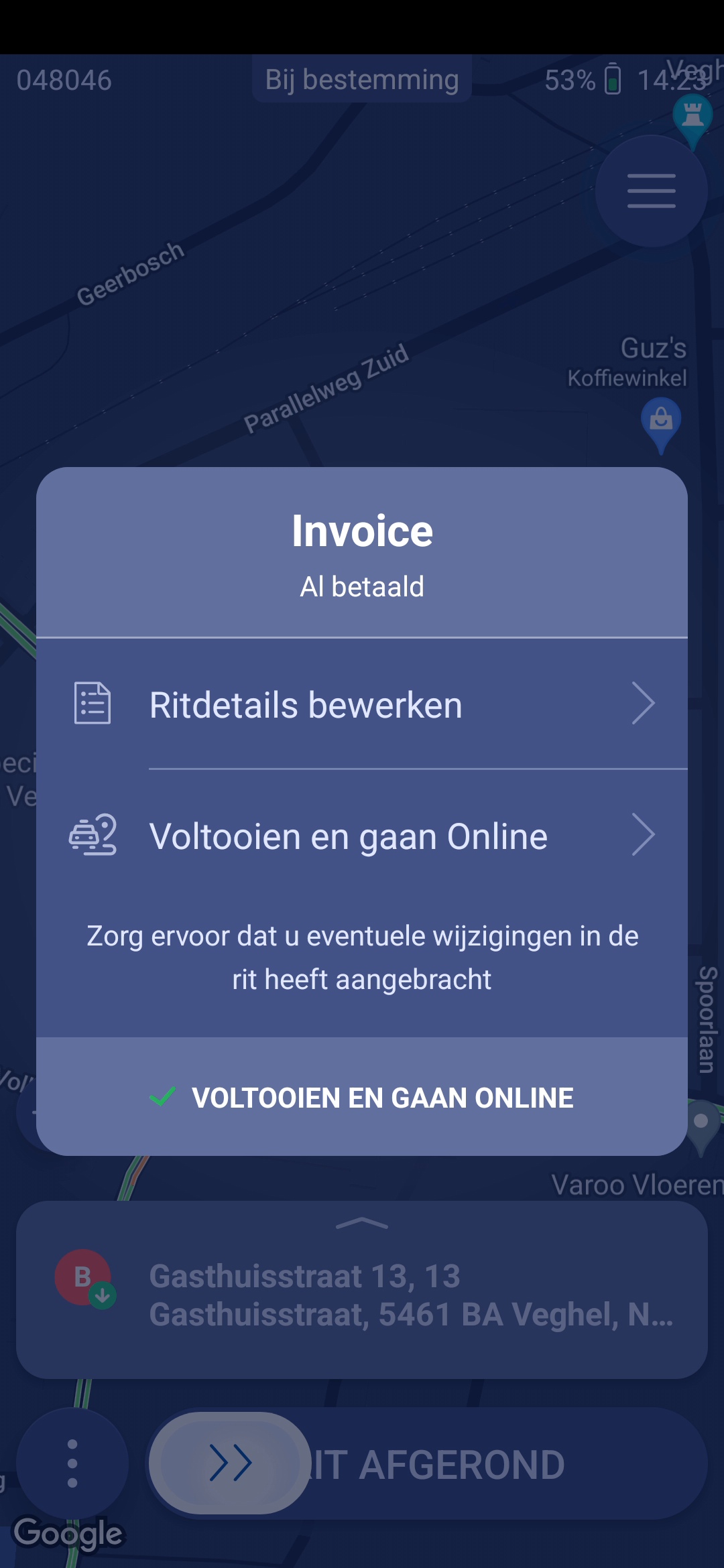 - Swipe hier naar rechts bij "RIT AFGEROND" om de rit af te ronden, je ziet het volgende scherm als de rit al is betaald: