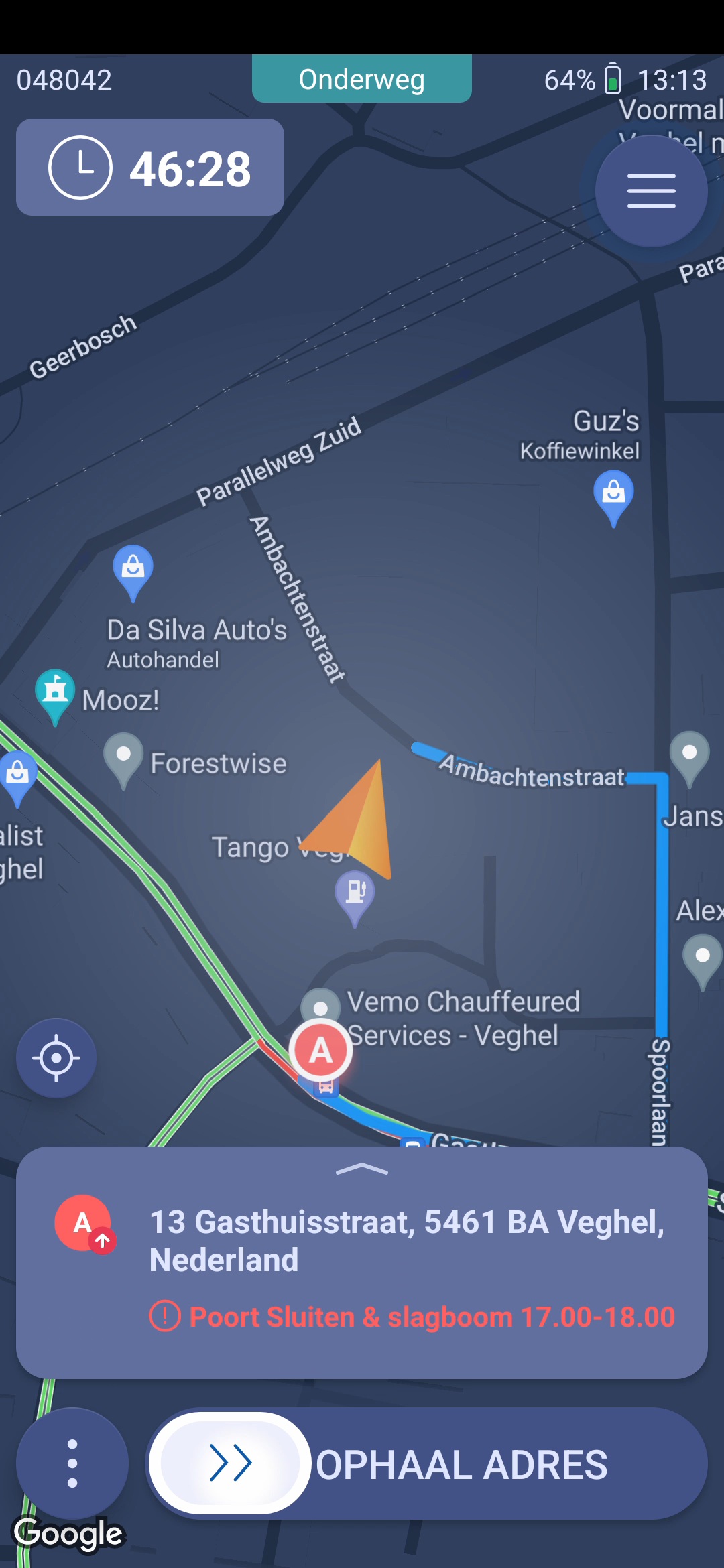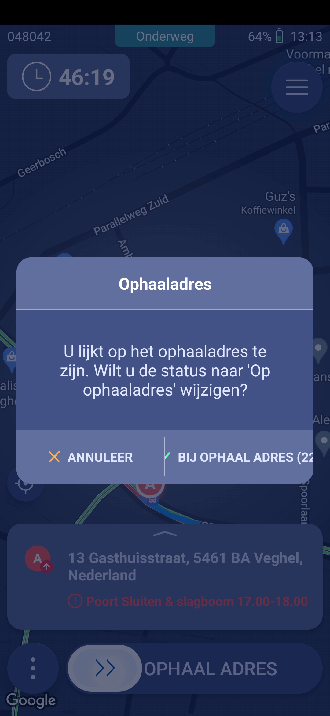 - Klik hier op "BIJ OPHAAL ADRES" om je status te veranderen en de klant een automatisch aankomst-bericht te versturen of klik op "ANNULEER" als je dit pas later wil doen. Na 30 seconden niets doen verandert je status automatisch naar "BIJ OPHAAL ADRES". Na het veranderen van je status naar "BIJ OPHAAL ADRES" d.m.v. de popup of handmatig door te swipen, zie je het volgende scherm: