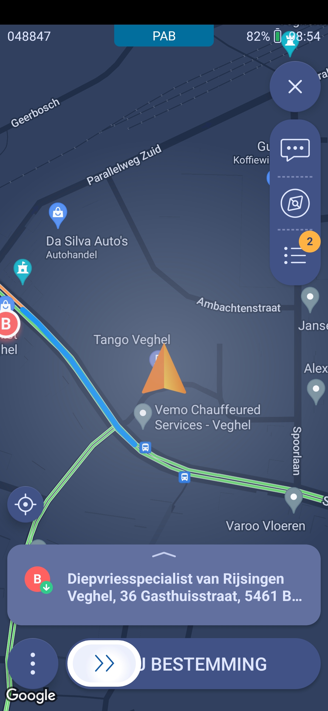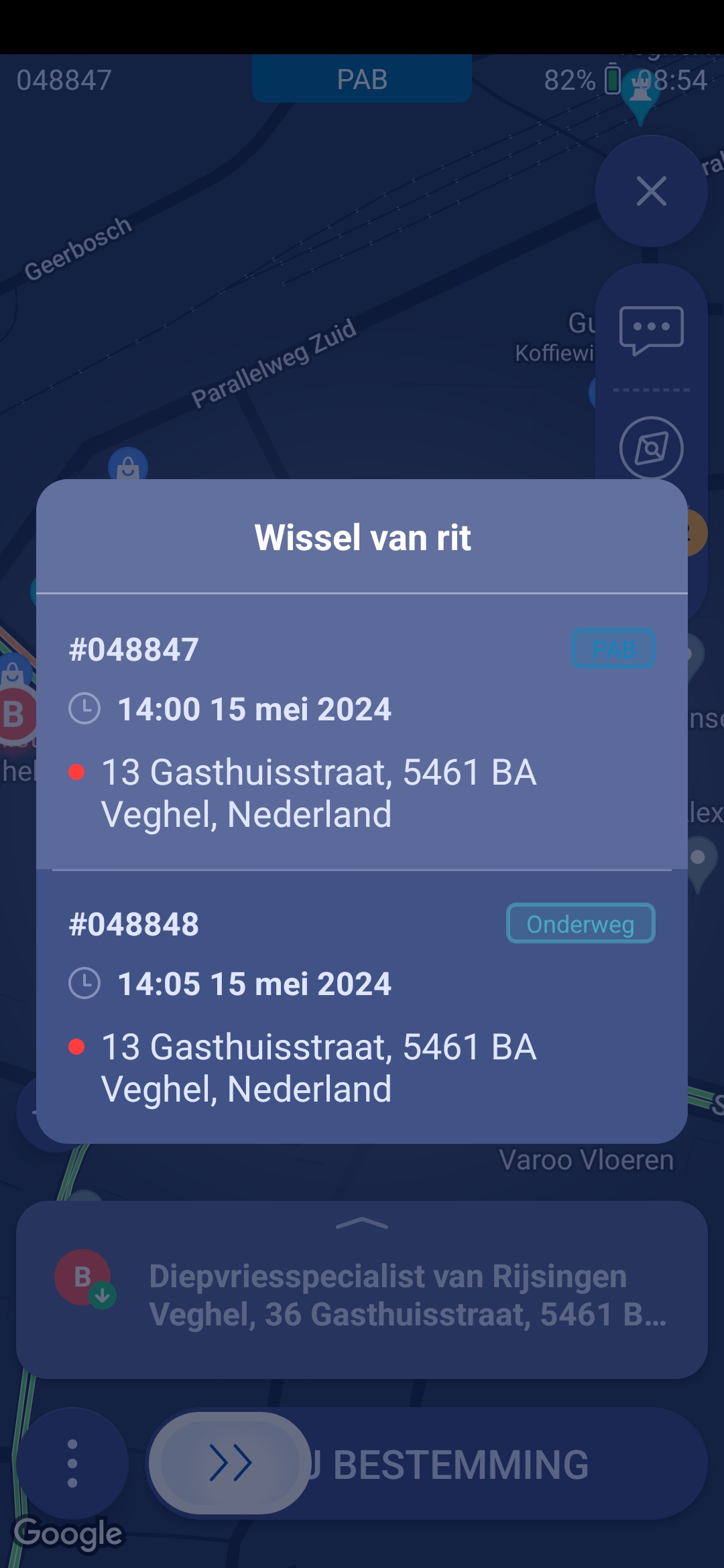 - Hier zie je de verschillende ritten die je aan het doen bent en hun status, klik hier op de rit waarvan je de status wil veranderen, informatie in wil zien of wil navigeren, je ziet het volgende scherm: