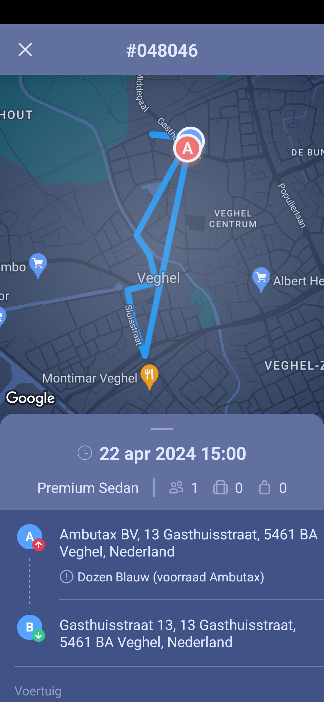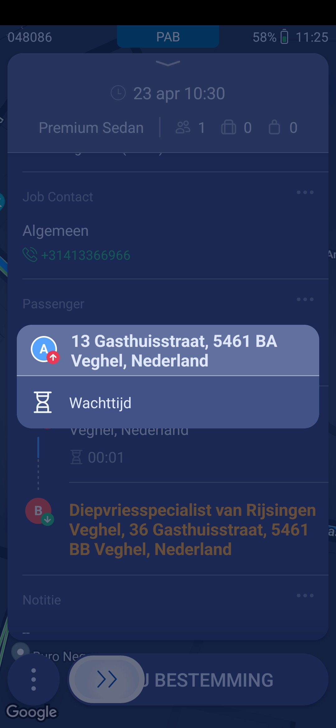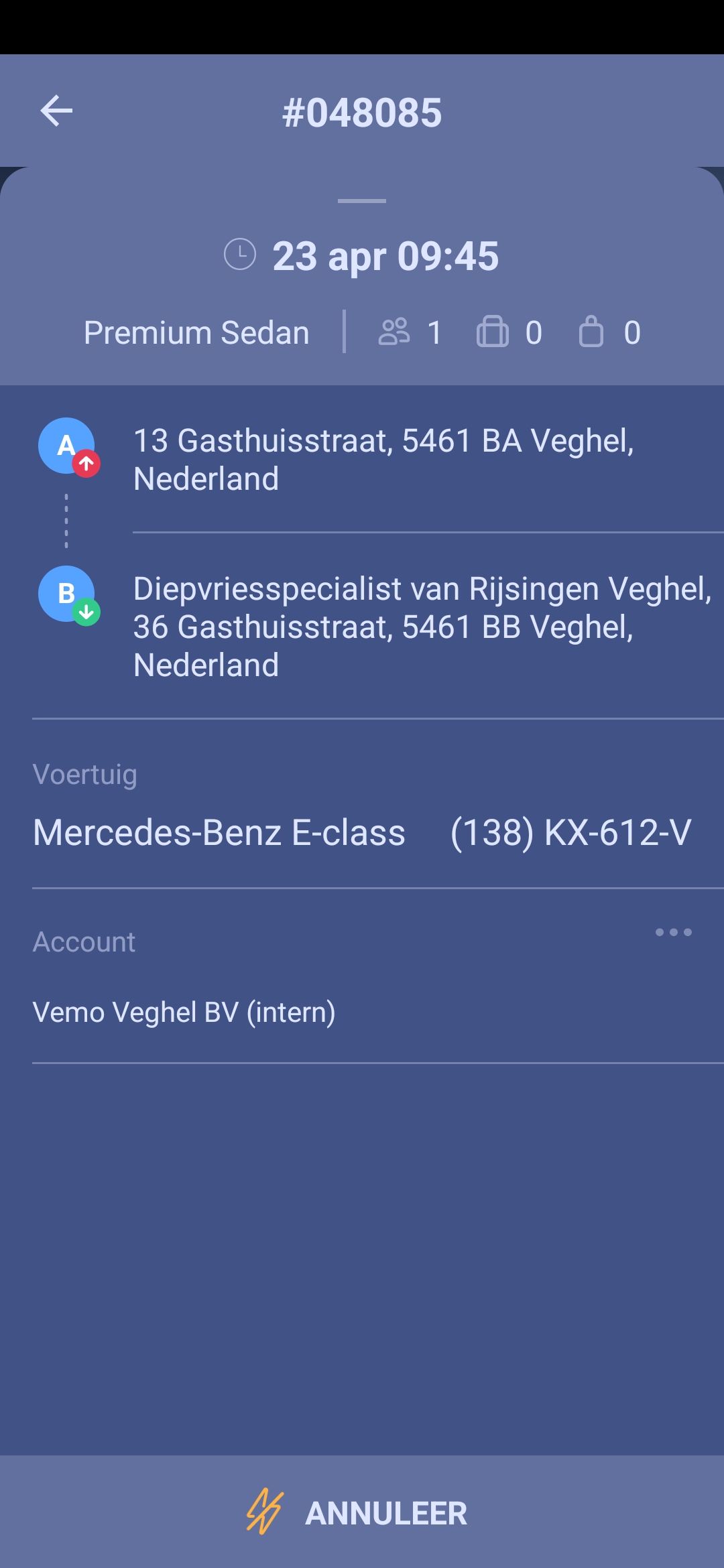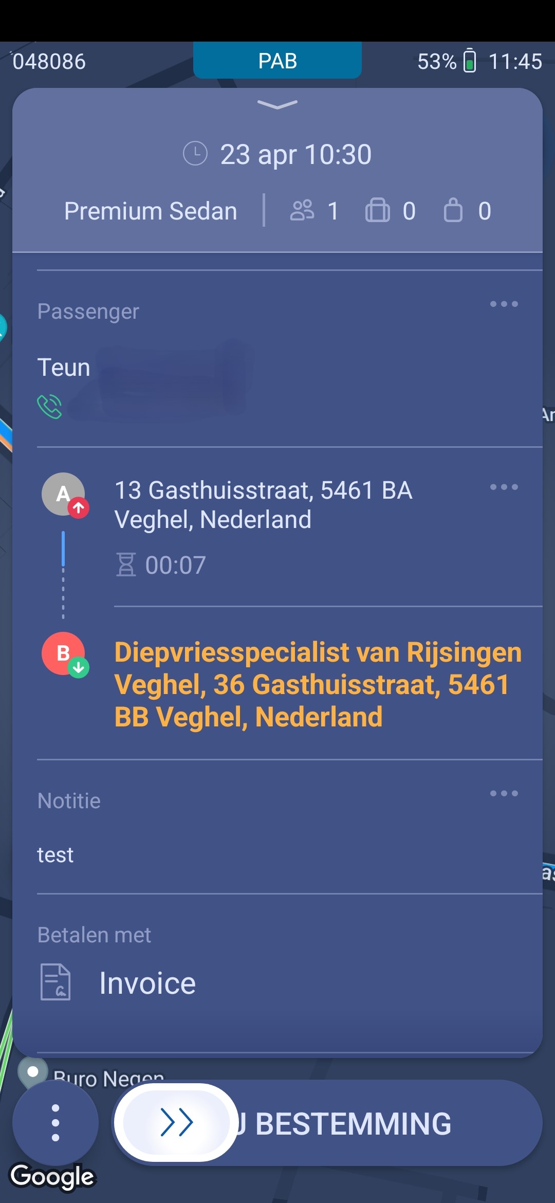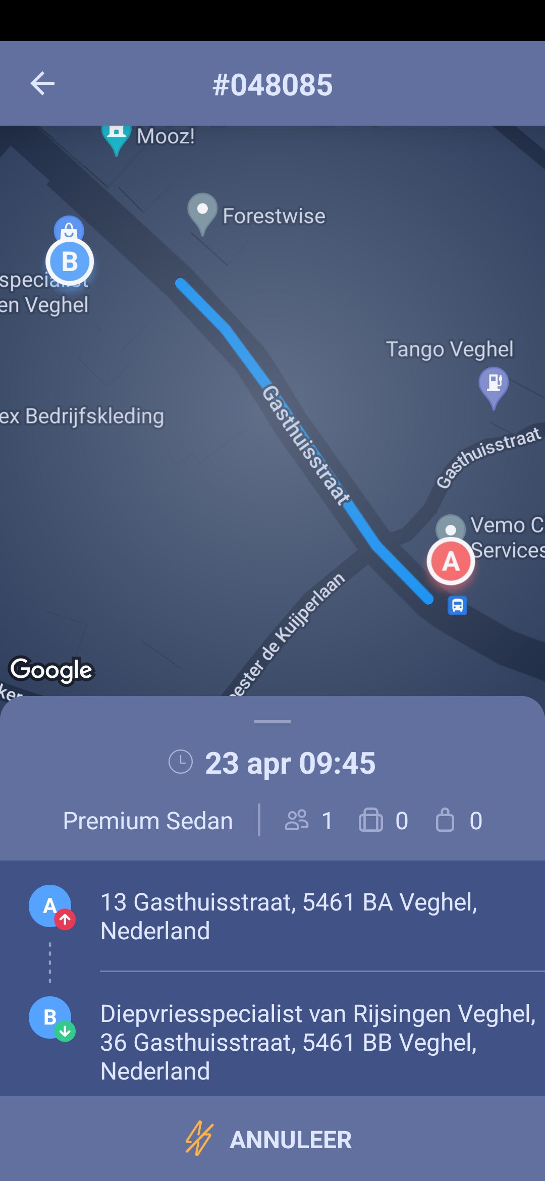 - Klik op het adres onder in het scherm om de ritinformatie te openen, je ziet het volgende scherm:
