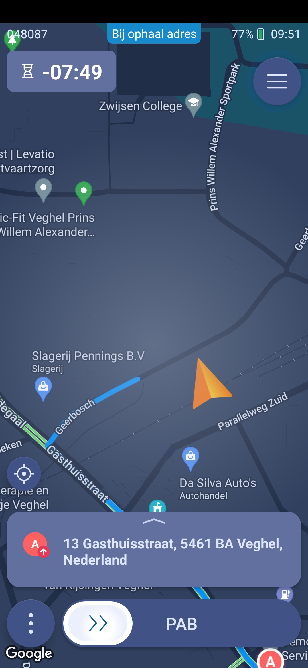 In volgorde van boven naar beneden de verschillende adressen die je gaat bezoeken. Het adres wat is dikgedrukt in oranje is het eerstvolgende adres wat je gaat bezoeken, dit is ook het adres waar de app naar toe zal navigeren als je de navigatie aanzet.