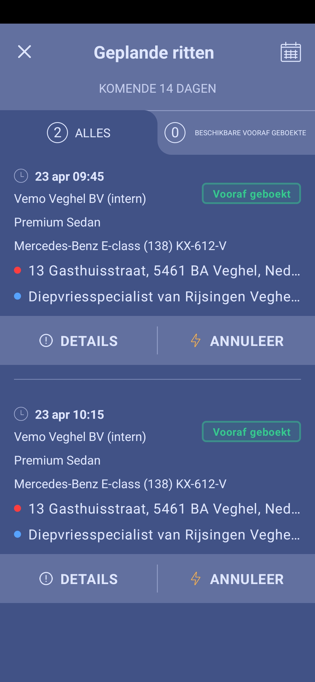 - Als er in de gekozen tijd ritten geplant staan, zijn deze nu hier te zien. Klik op "DETAILS" bij de rit die je wil bekijken om de ritinformatie over deze rit in te zien. Je ziet dan het volgende scherm:
