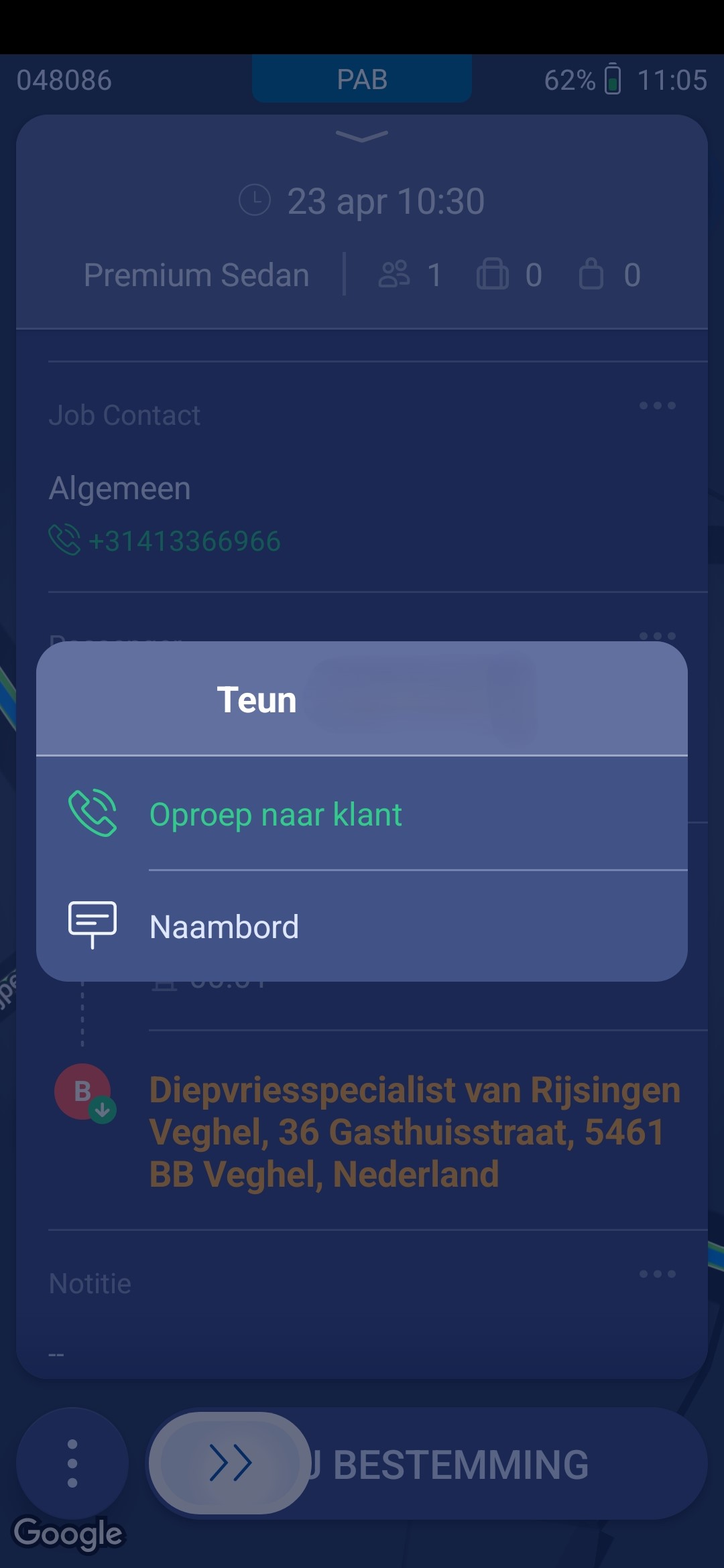 - Zorg er voor dat je een rit aan het doen bent en volg stappen 1 en 2 onder het kopje "Huidige rit" en klik daar op de naam van de klant die je wil bellen, je ziet het volgende scherm: