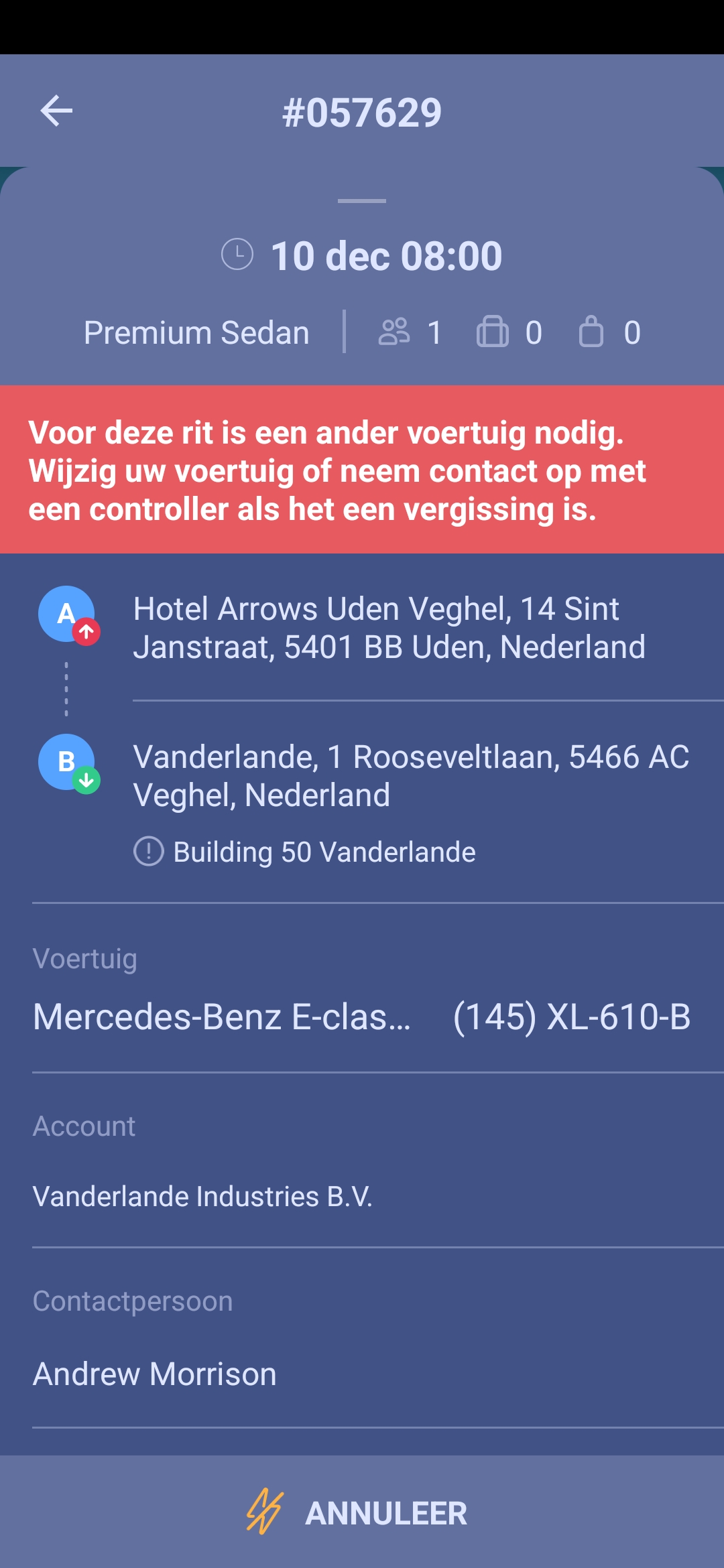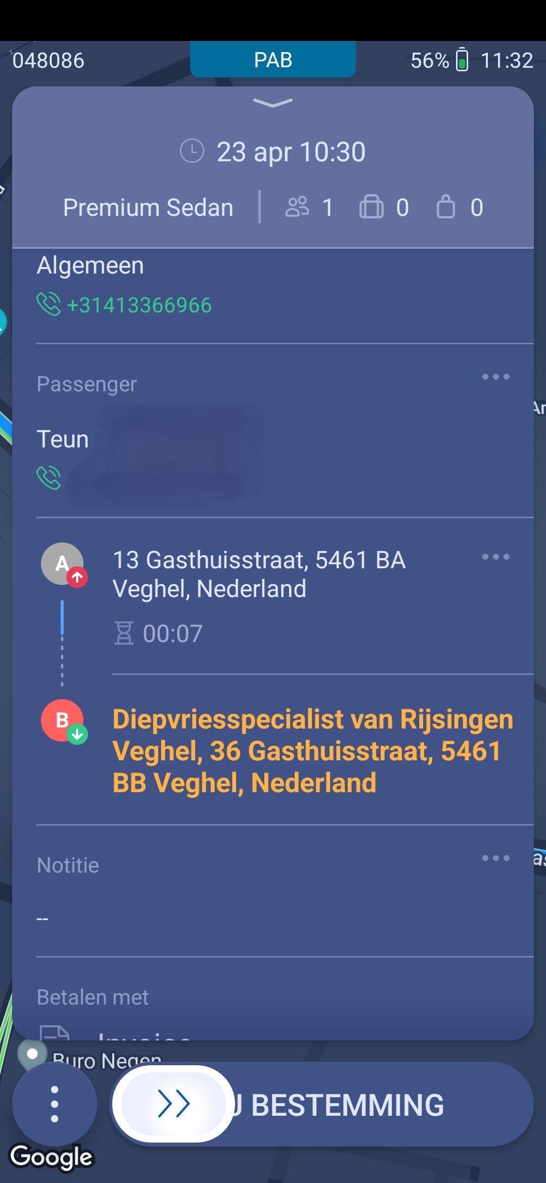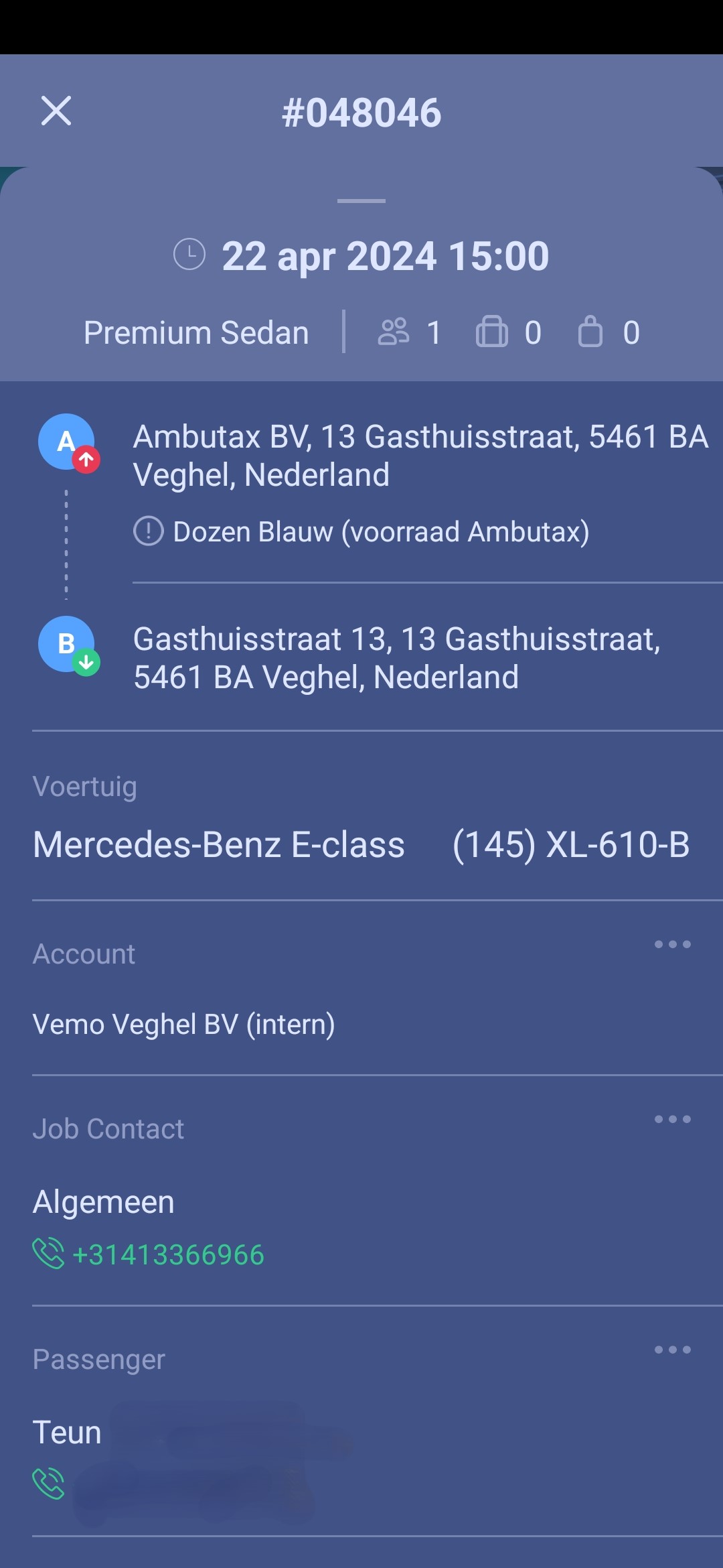 Het contactpersoon van de rit en dus de gene die de rit geboekt heeft. Mocht er iets mis gaan met de rit en krijg je de klant niet te pakken, kan er contact worden opgenomen met het contactpersoon.