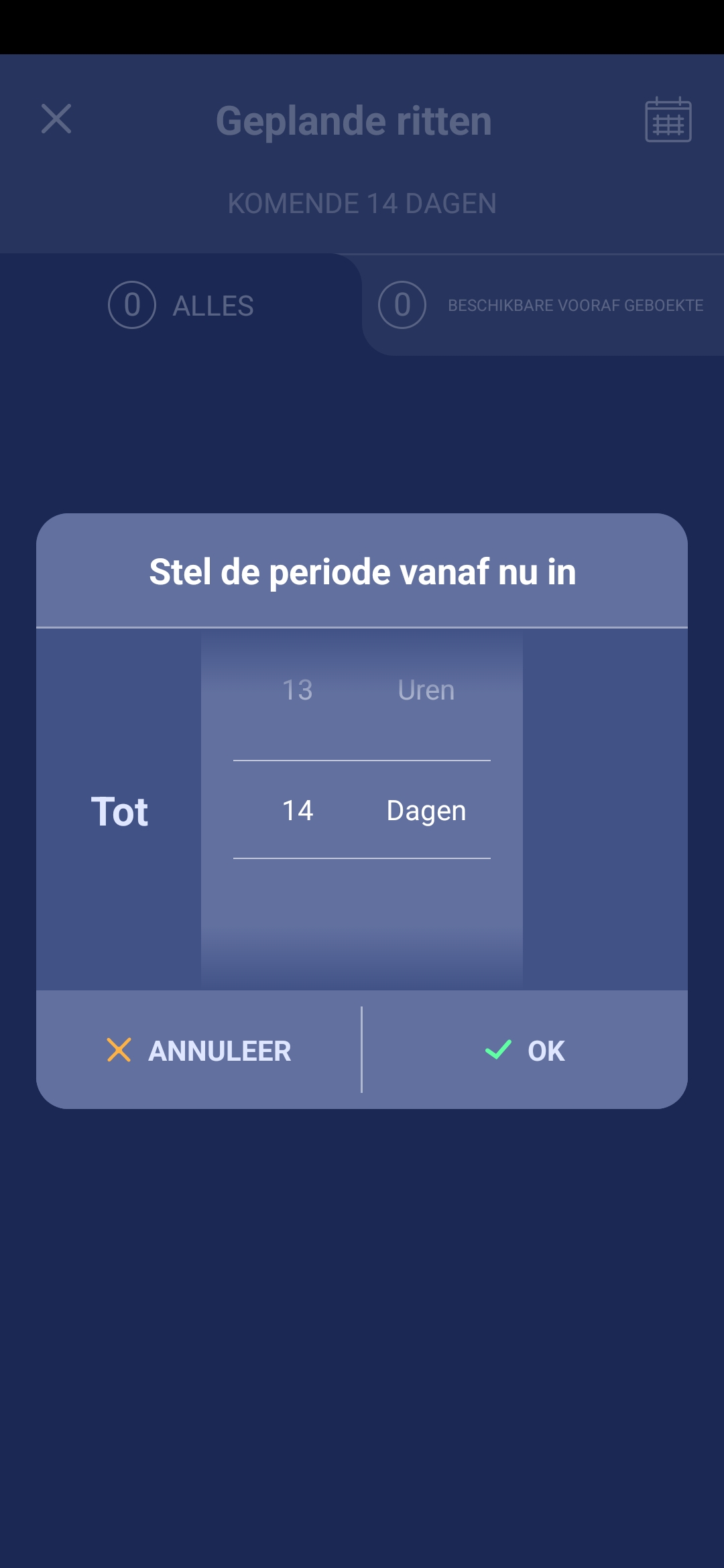 - Als er ritten geplant zijn, staan hier je geplande ritten. Om de tijd die vooruitgekeken word aan te passen, klik rechtsboven op het agendaatje, je ziet het volgende scherm: