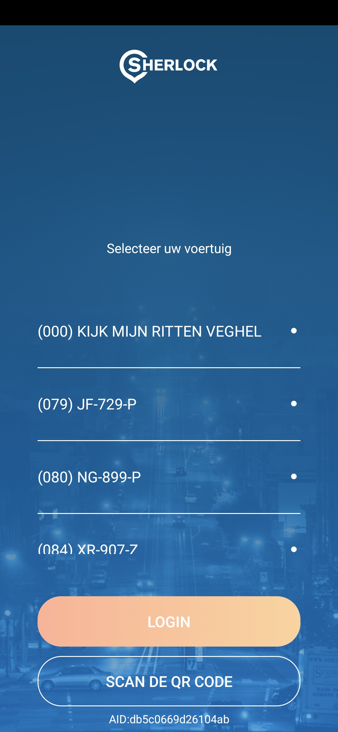 - Kies bij aanvang van je dienst hier de auto waarmee je gaat werken en kies voor je dienst voor "KIJK MIJN RITTEN VEGHEL/VELDHOVEN". Klik vervolgens op "LOGIN", je ziet het volgende scherm: