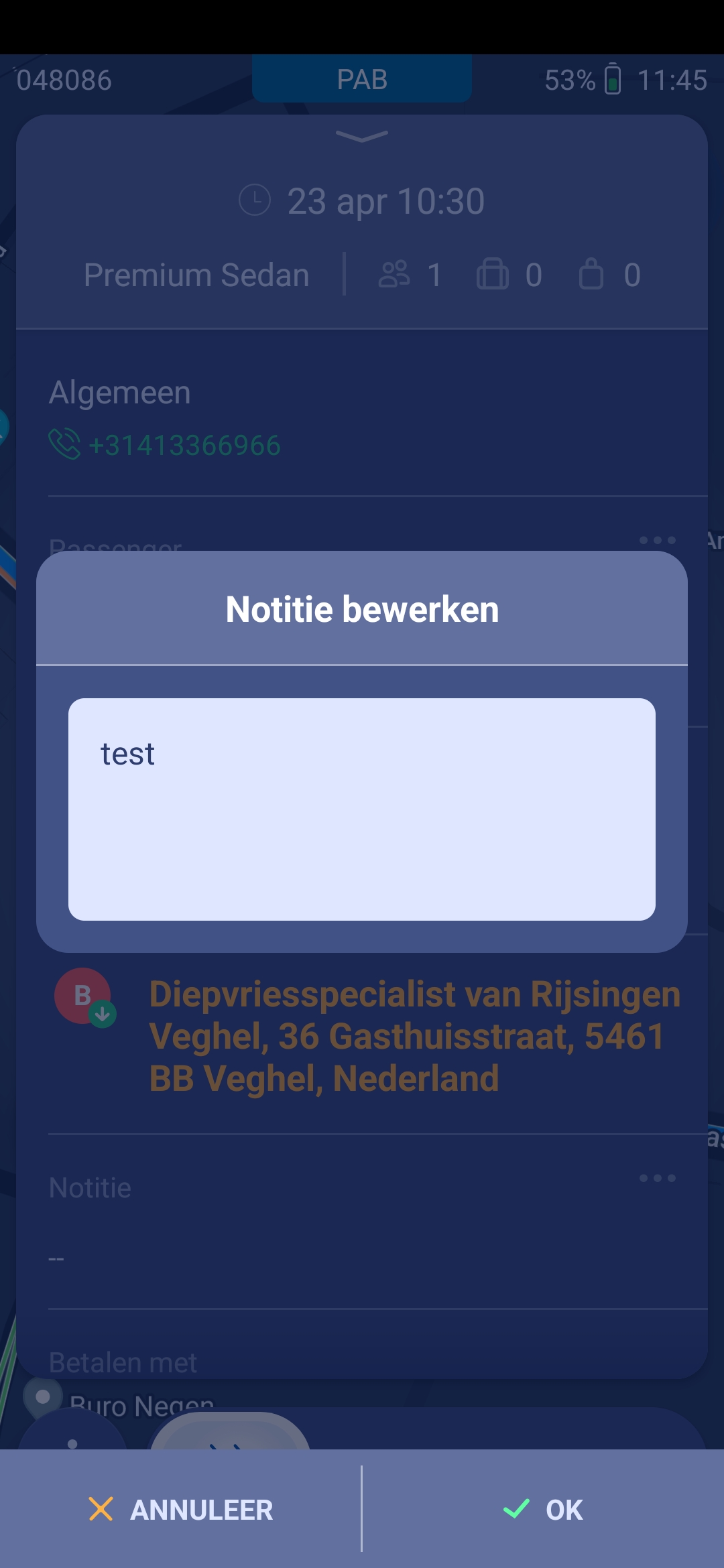 Als chauffeur heb je de optie om een notitie achter te laten bij de rit. Dit kan gaan omdat er een bepaalde situatie zich voordeed waarvan je een notitie wil maken, de planning daar om vraagt of omdat je zelf iets bij deze rit wil noteren. Dit kan tijdens een rit door de onderstaande stappen de volgen.