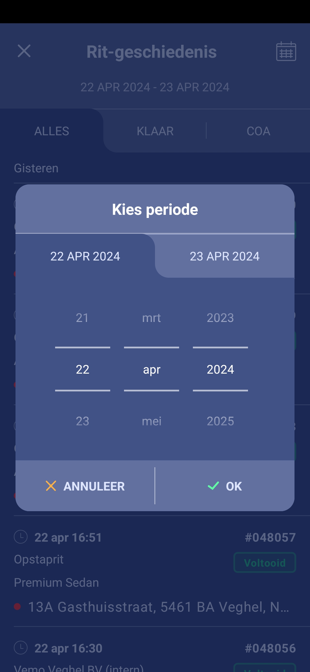 - Kies hier de "vanaf" en de "tot" tijd en klik op "OK" om ritten tussen deze tijden te zoeken, je ziet het volgende scherm: