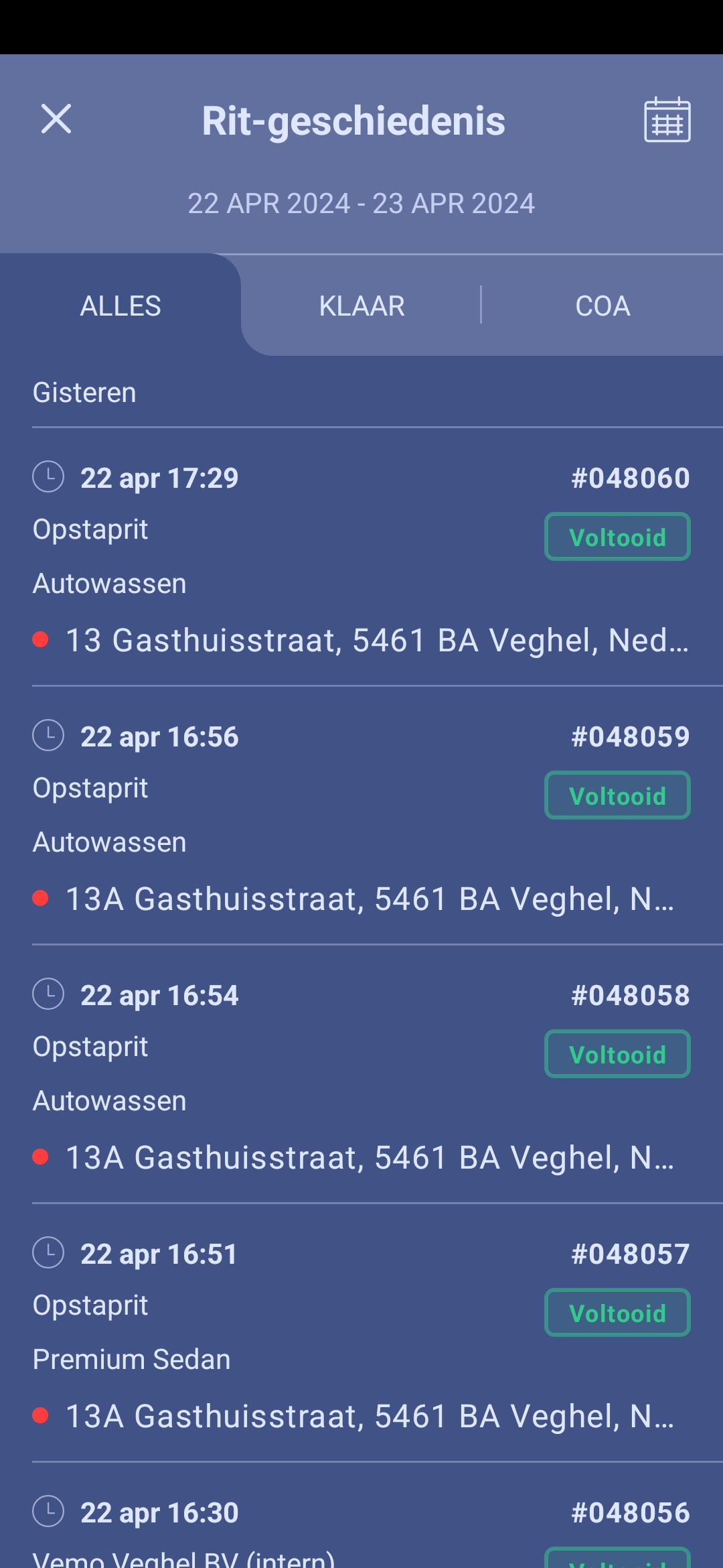 - Volg stappen 1 t/m 3 van "Geplande ritten" en klik hier op "Rit-geschiedenis", je ziet het volgende scherm: