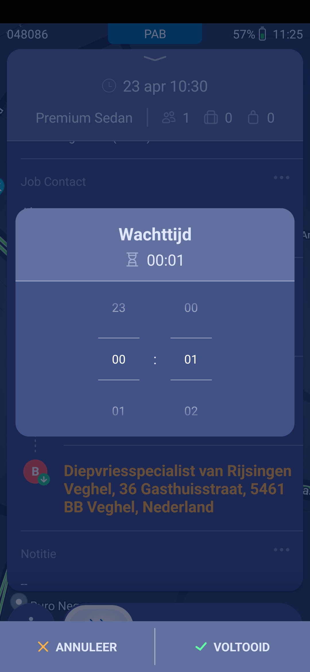 - Zorg er voor dat je een rit aan het doen bent en volg stappen 1 en 2 onder het kopje "Huidige rit" en klik daar op het adres waarbij je de wachttijd wil aanpassen, je ziet het volgende scherm: