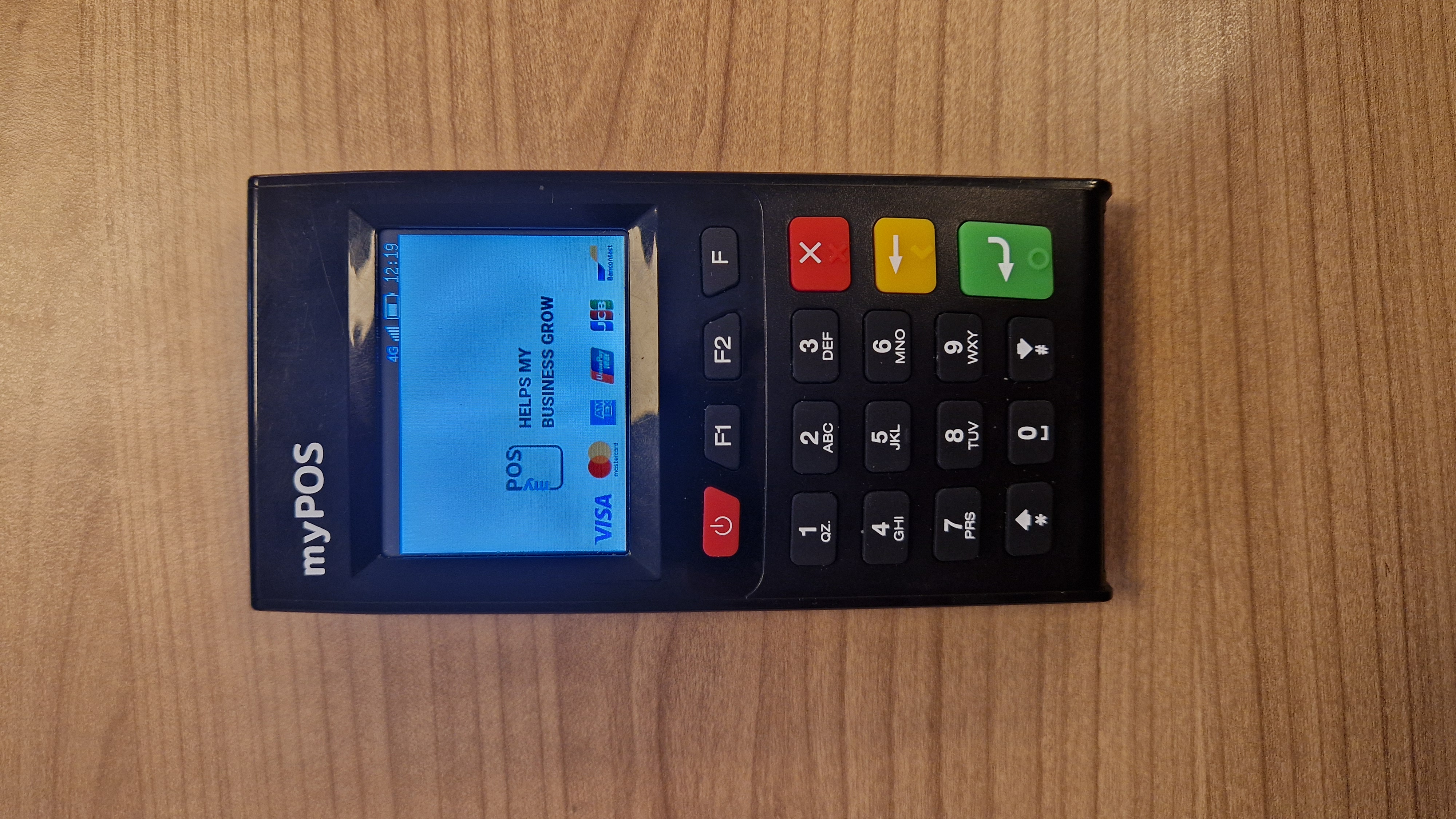 - Houd de aan/uit knop ingedrukt tot het volgende scherm aangaat en het pinapparaat piept. Het apparaat is dan aan het opstarten en heb even geduld tot je het volgende scherm ziet: